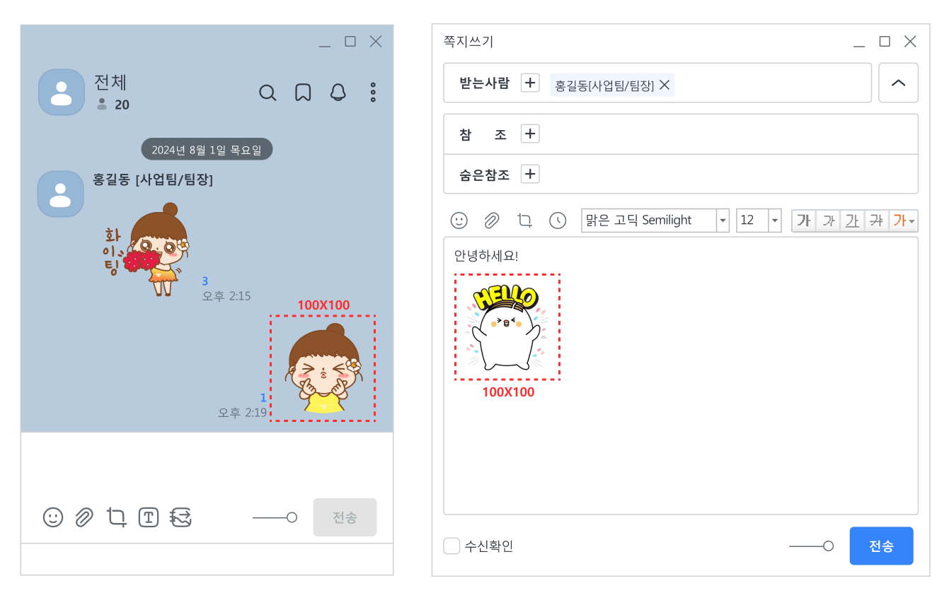 ※ 이모티콘 이미지 사이즈를 800X800 으로 받는 이유는 이미지의 깨짐을 우려하여 적용되는 이미지보다 크게 전달 받고 있습니다.